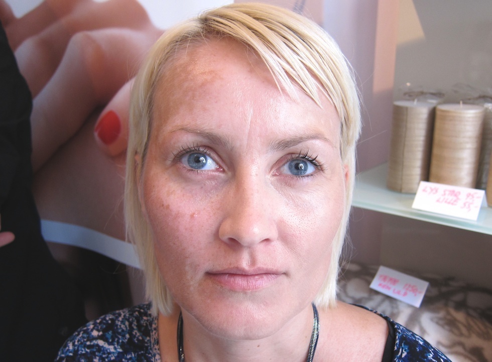 Her kan du fx. se en model med melasma – hyperpigmentering efter hormonforandringer. Hendes melasma er lige tydelig i begge sider uden makeup. Makeupartist Astrid Faurbye for La Roche-Posay har her demonstreret, hvordan man med en så relativ let foundation som Toleraine Teint Creme kan dække selv alvorlig melasma. Først har hun dækket de mest markante overgange med La Roche-Posays concealer, og derefter har hun brugt den kompakte cremefoundation til at bygge foundation op med. Jeg behøver næppe fortælle, hvilken side der er med makeup, og hvilken der er uden.