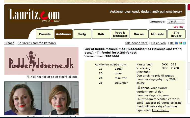 Vi har sat to makeupskoler a fire personer på auktion. Jo højere pris, jo flere penge til AIDS-Fondet. Vi får ikke en krone. Lige nu er prisen på 325 kroner for fire pladser – det er et fund, så kom ind og byd på Lauritz.com her. Den anden finder du her og der er prisen lavere lige nu.